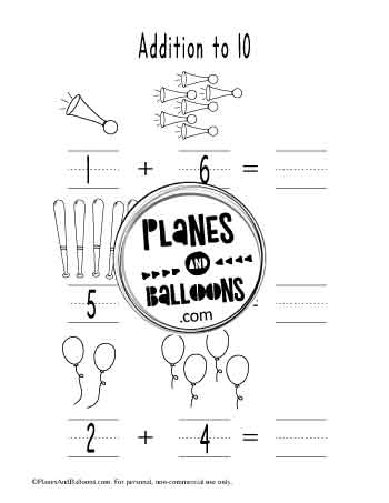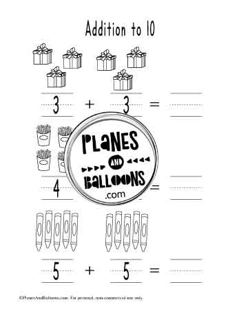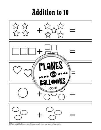 They include addition to five and addition to ten worksheets with pictures, so preschoolers can easily relate and count. This will help them grasp the concept of addition as putting objects together.
